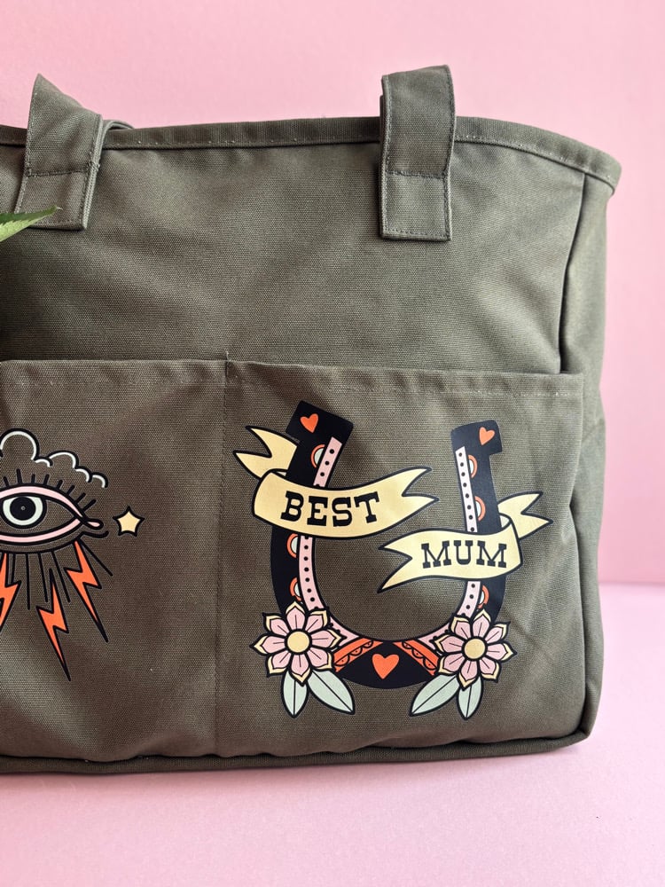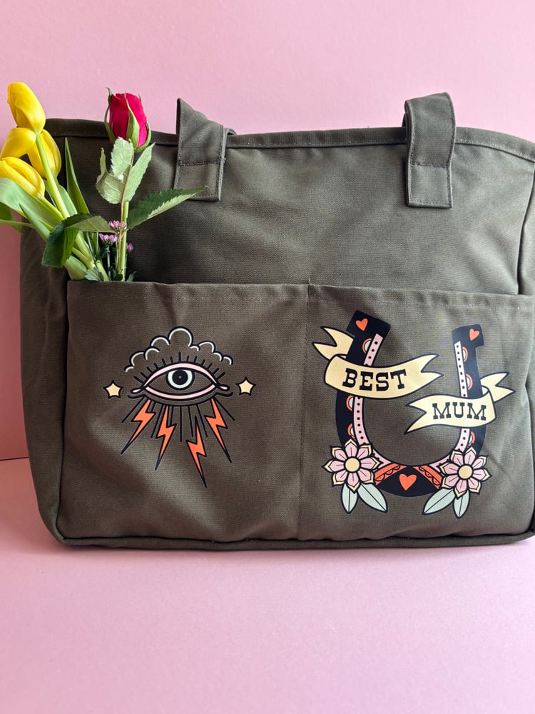 large thick canvas tote bag with two handles one large for shoulder wearing and one short for normal carrying
