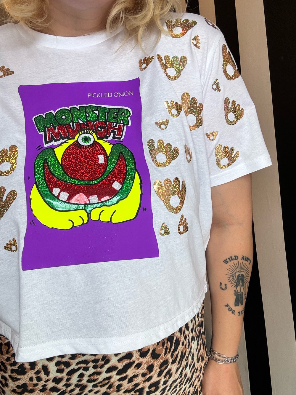 Hand printed and cut, each piece is carefully layered to create a sparkly neon version of the snack we love! Complete with monster claws, feet or whatever you like to think the are ;) in a holographic vinyl catching every single angle of the light!